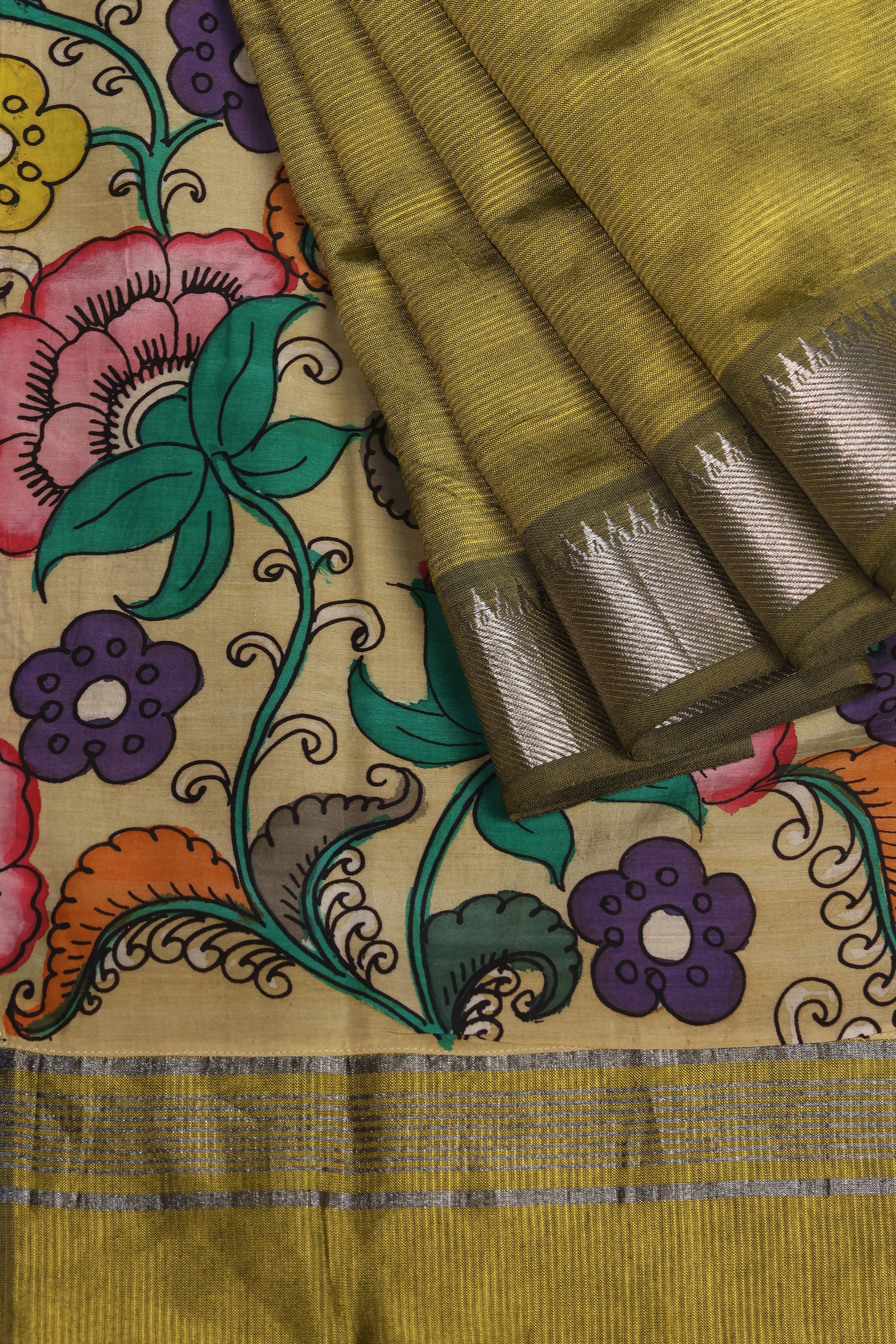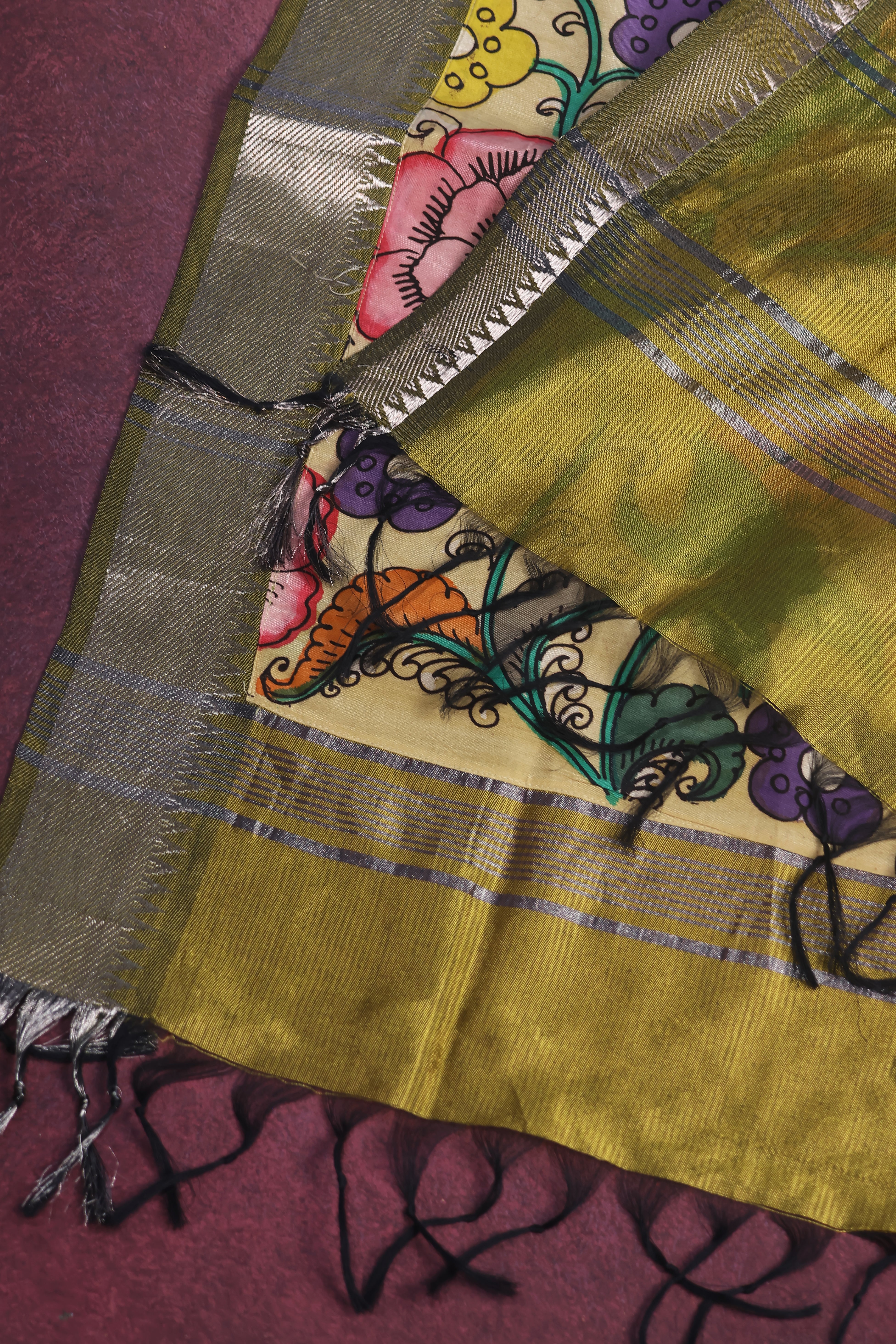 Green pure Mangalgiri silk with a hand painted pen kalamkari Anchal