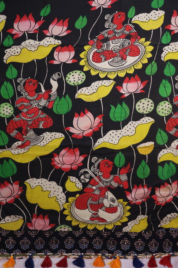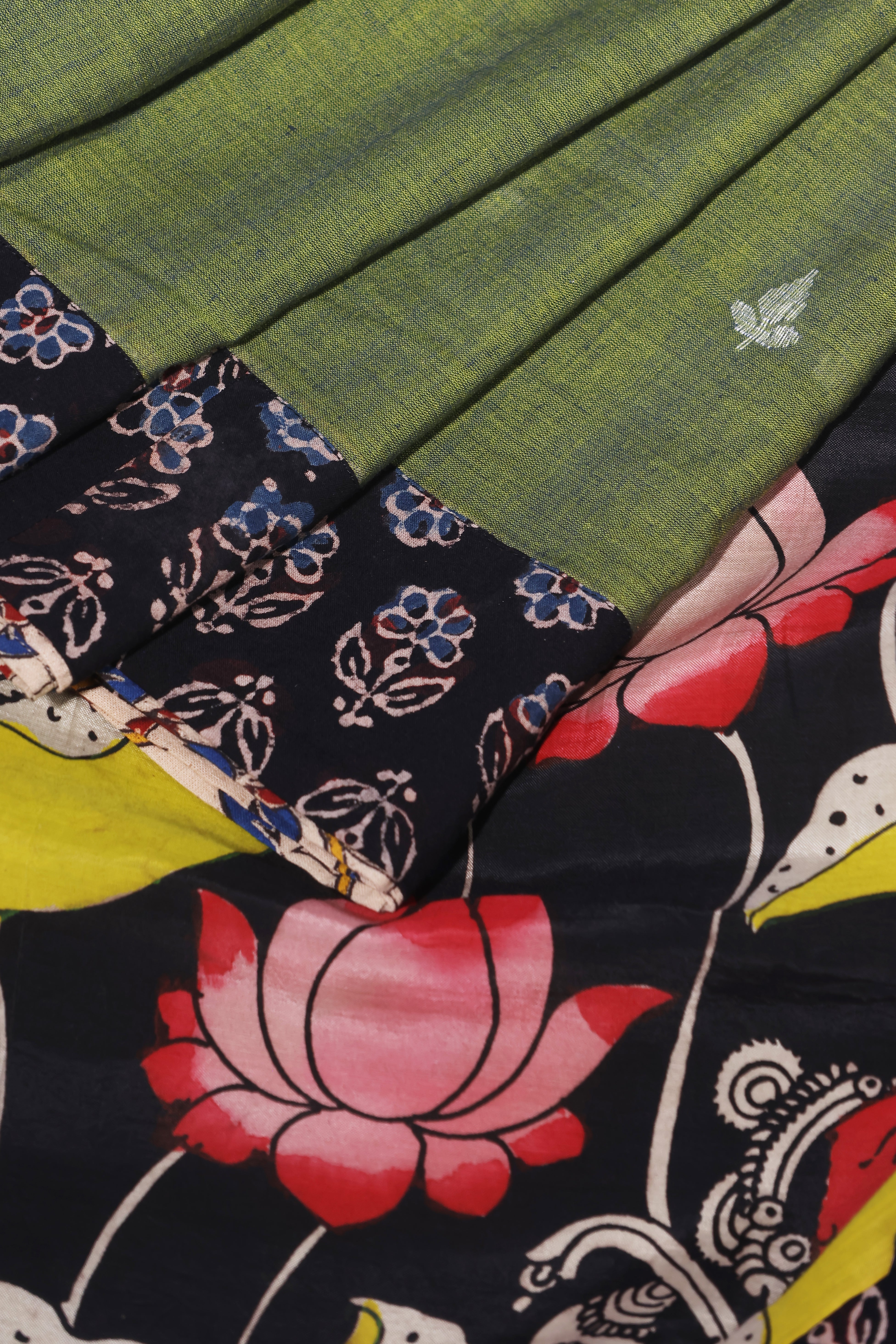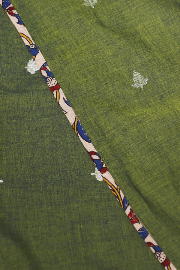 H.O.T curated - Moss green hand woven cotton jamdani with hand painted pure silk kalamkari Anchal and a double reverse border.