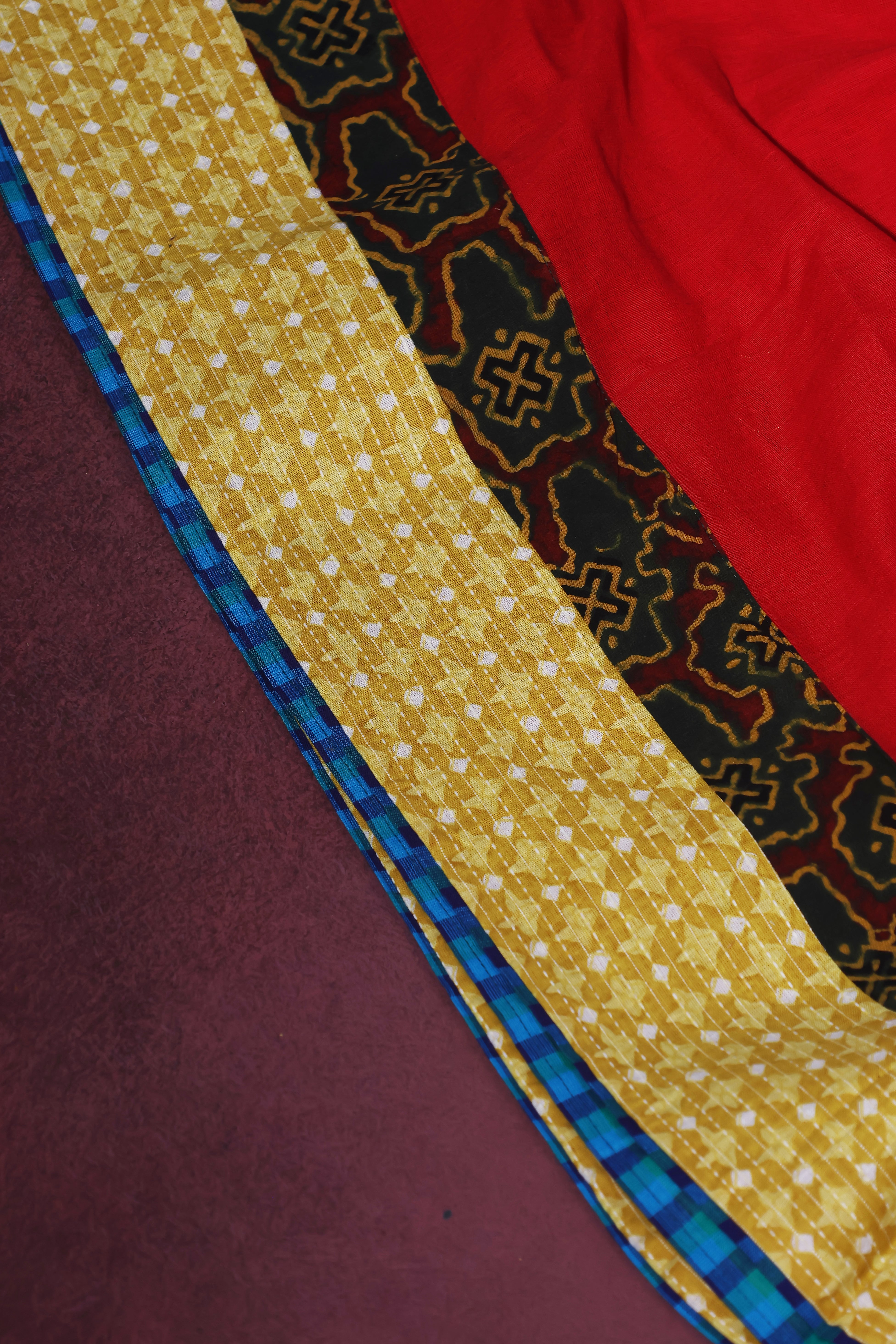 Make a statement with Red Mull Drama, a handwoven red khadi saree curated by House of Tisha. The saree features a double border — a paisley yellow outer border and an Ajrakh green inner border — contrasted with a striking electric blue Mangalagiri reverse, creating dynamic interplay of colors. The pallu is adorned with a Chandra Bindu motif, symbolizing power and elegance, adding a distinctive finishing touch.