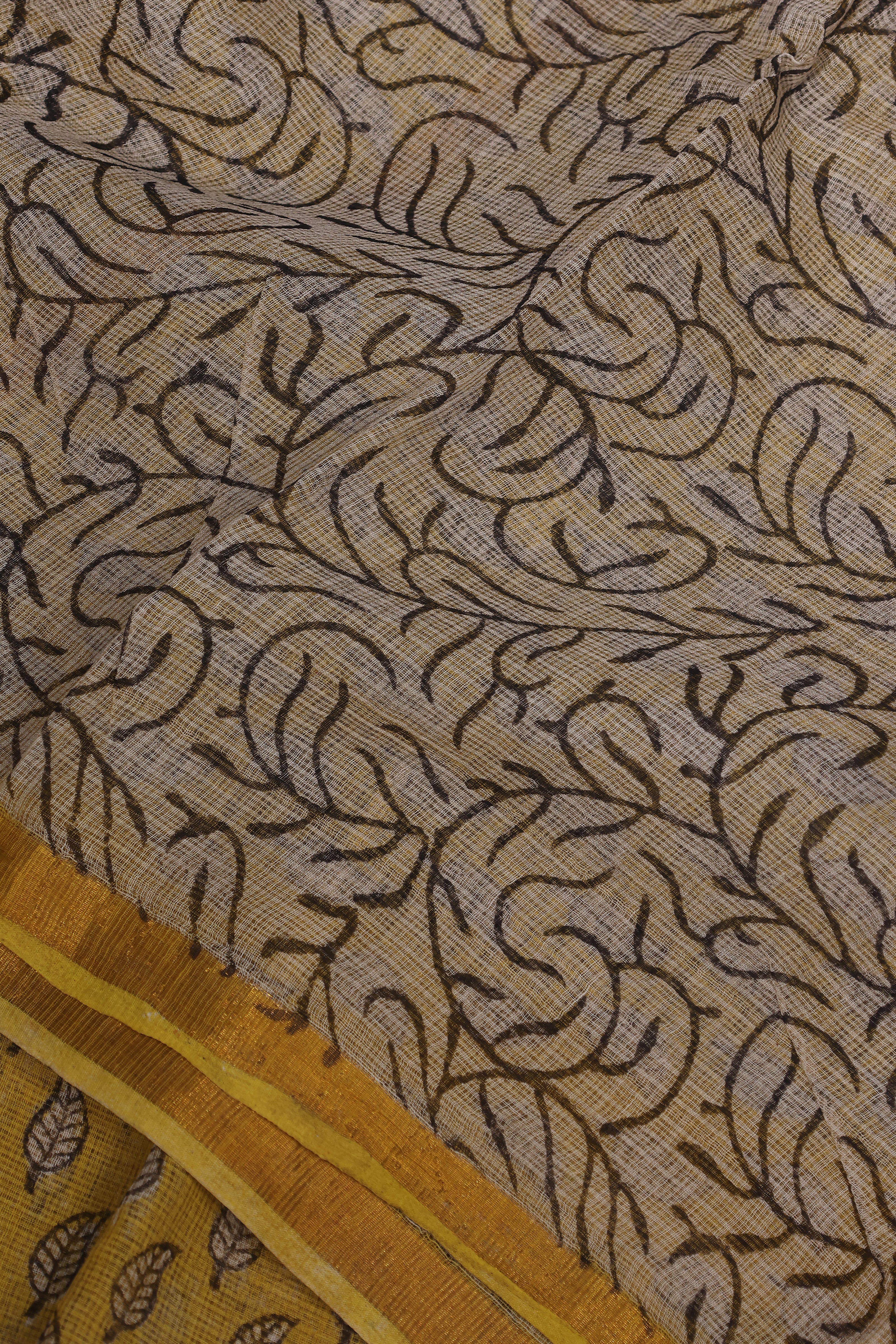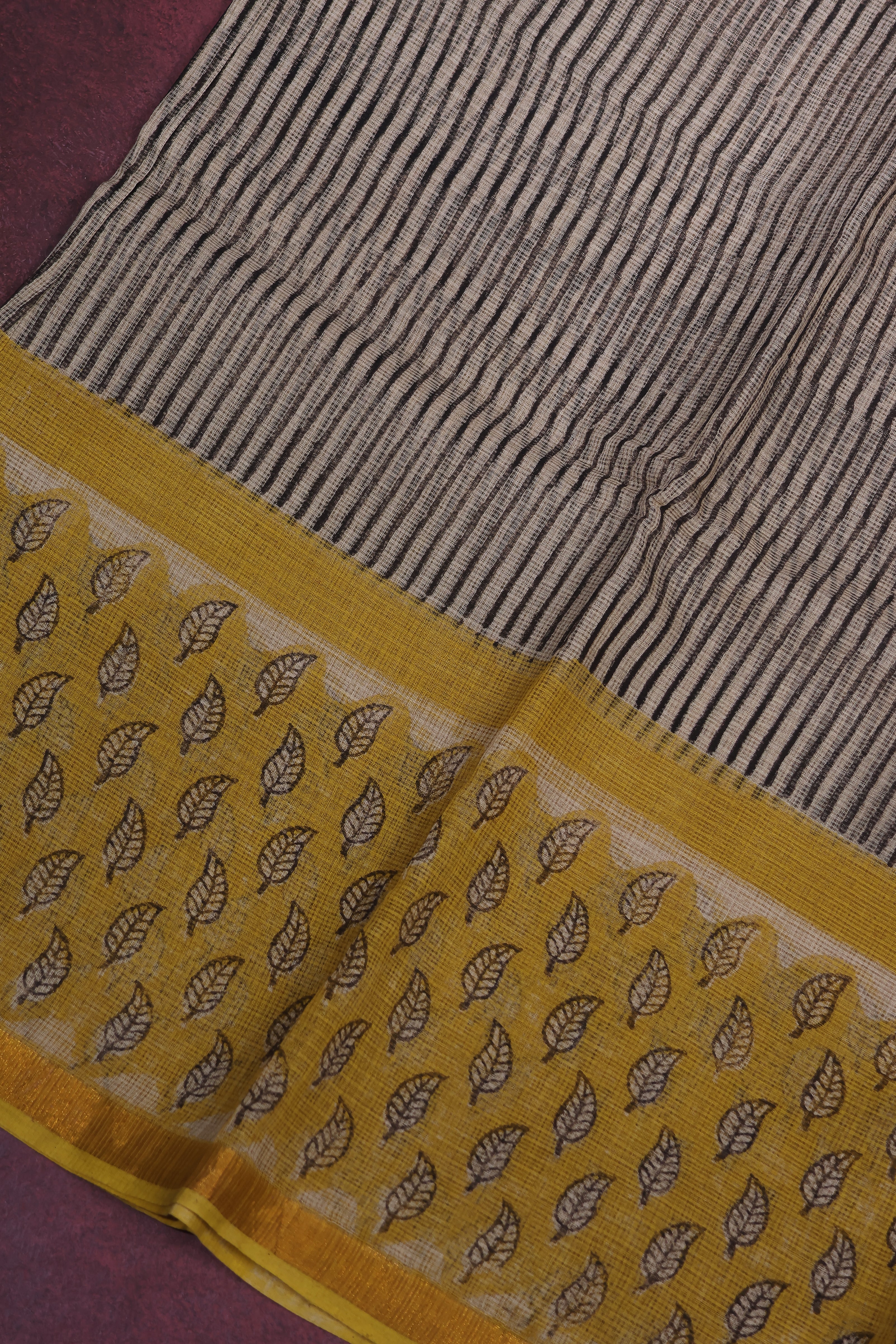 Bring timeless elegance to your wardrobe with this handwoven Kota Doria saree, featuring subtle black stripes on a lightweight, breathable fabric. The saree is enhanced with a vibrant yellow hand-block printed border, adding a pop of color and artisanal charm
