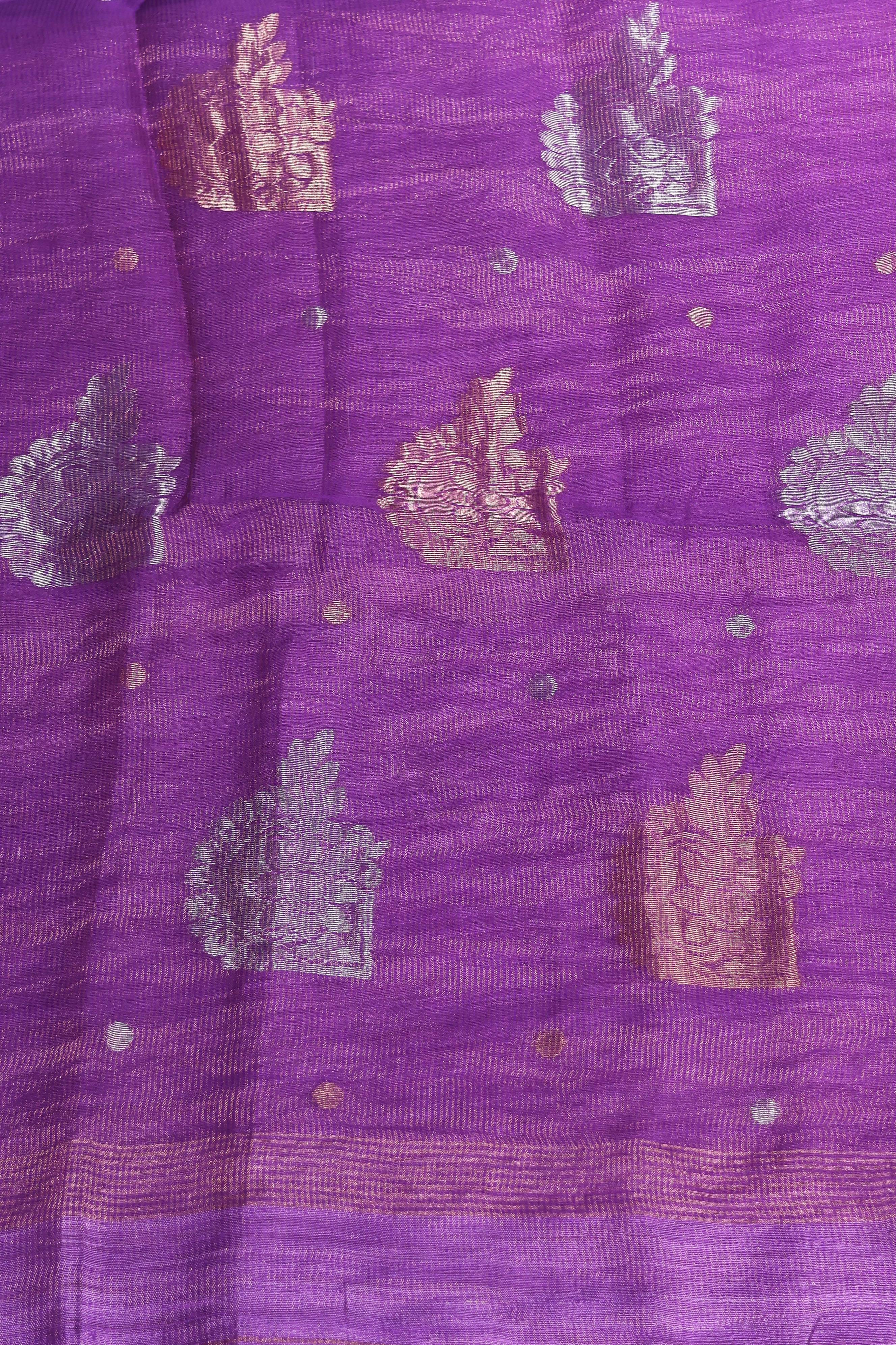 Bold. Elegant. Unforgettable. This Lavender Matka-MUSLIN saree is a celebration of craftsmanship and contemporary allure. Handwoven in a luxurious blend of textures, it features stunning copper and silver motifs that shimmer with every step — creating a look that’s effortlessly festive and undeniably striking.