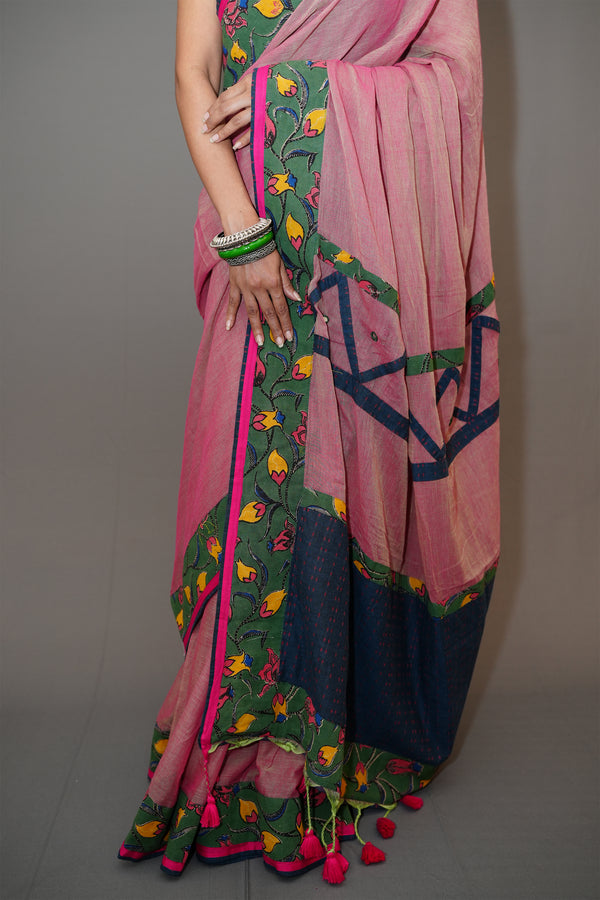 A beautiful mul in dusty rose pink, patch worked with green and blue borders and a stunning mirror work pallu