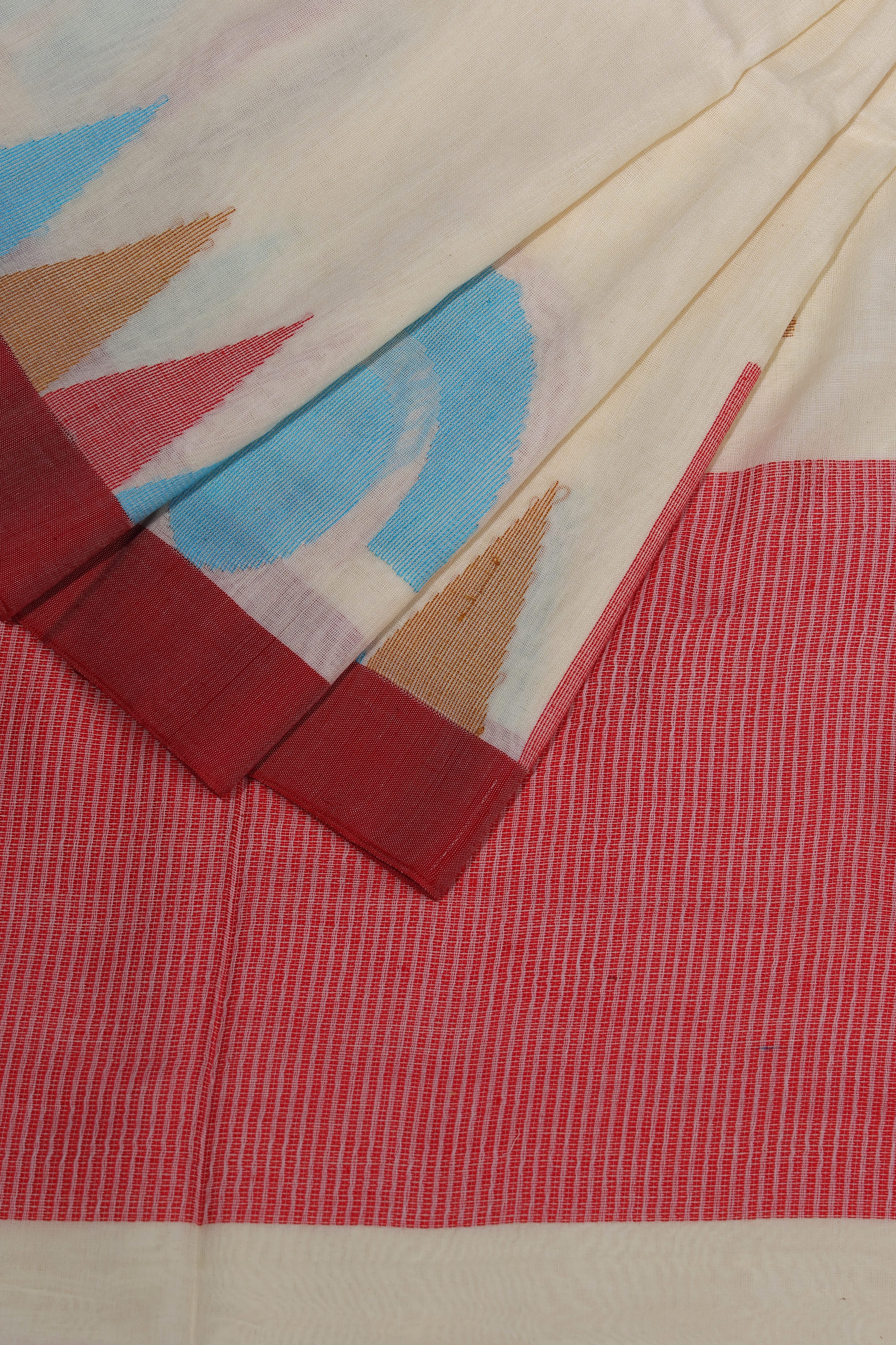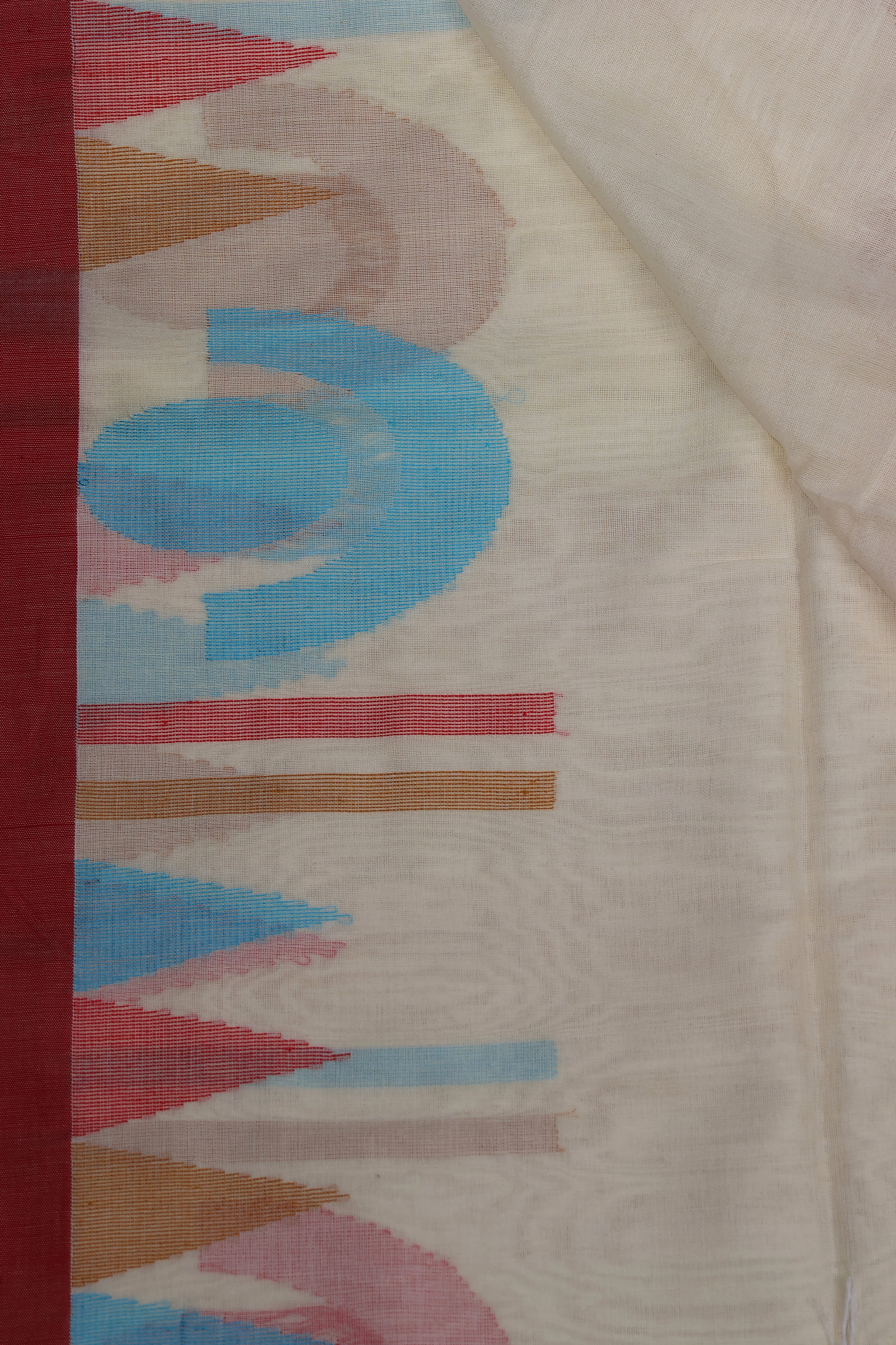 Celebrate Durga Pujo and festive occasions with this off-white handwoven cotton saree, featuring delicate geometric motifs woven throughout its border. Crafted from pure handwoven cotton with Laal Par (red border), the saree exudes understated elegance while staying festive and vibrant.