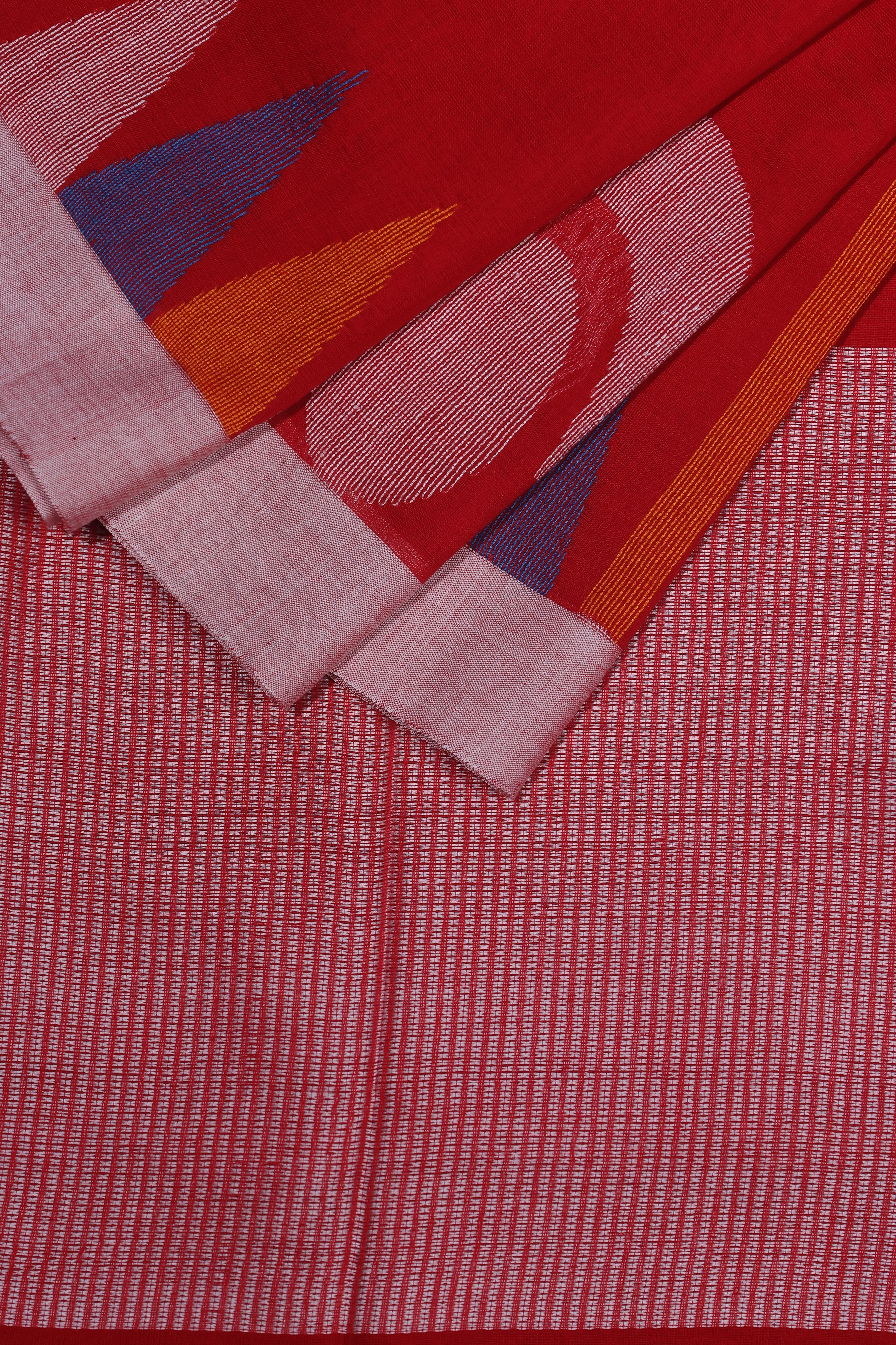 Celebrate Durga Pujo and festive moments with this red handwoven cotton saree, featuring striking geometric motifs that combine tradition with contemporary flair. Crafted from pure handwoven cotton, the saree is lightweight, breathable, and gracefully drapes to create an elegant festive look.