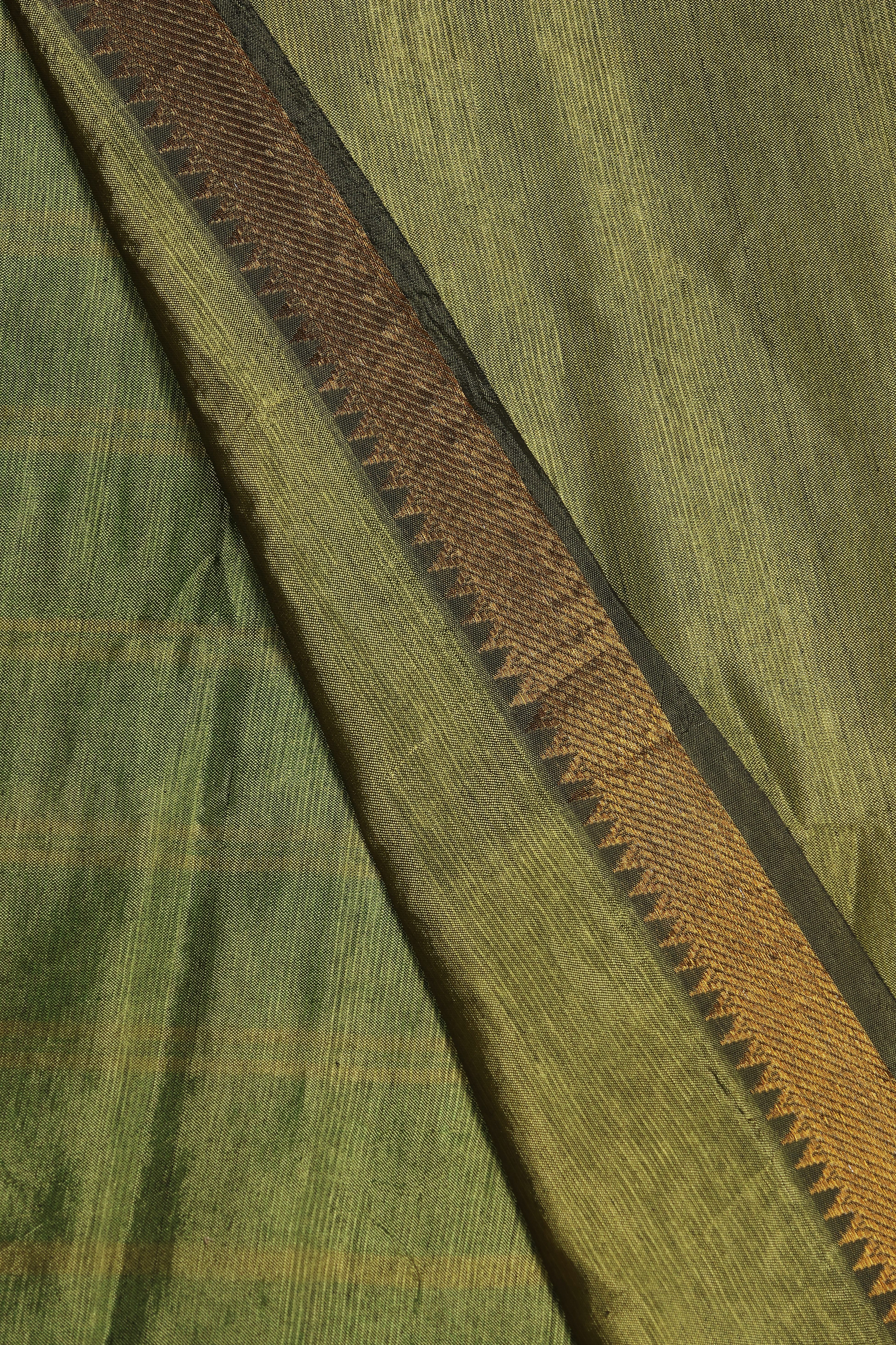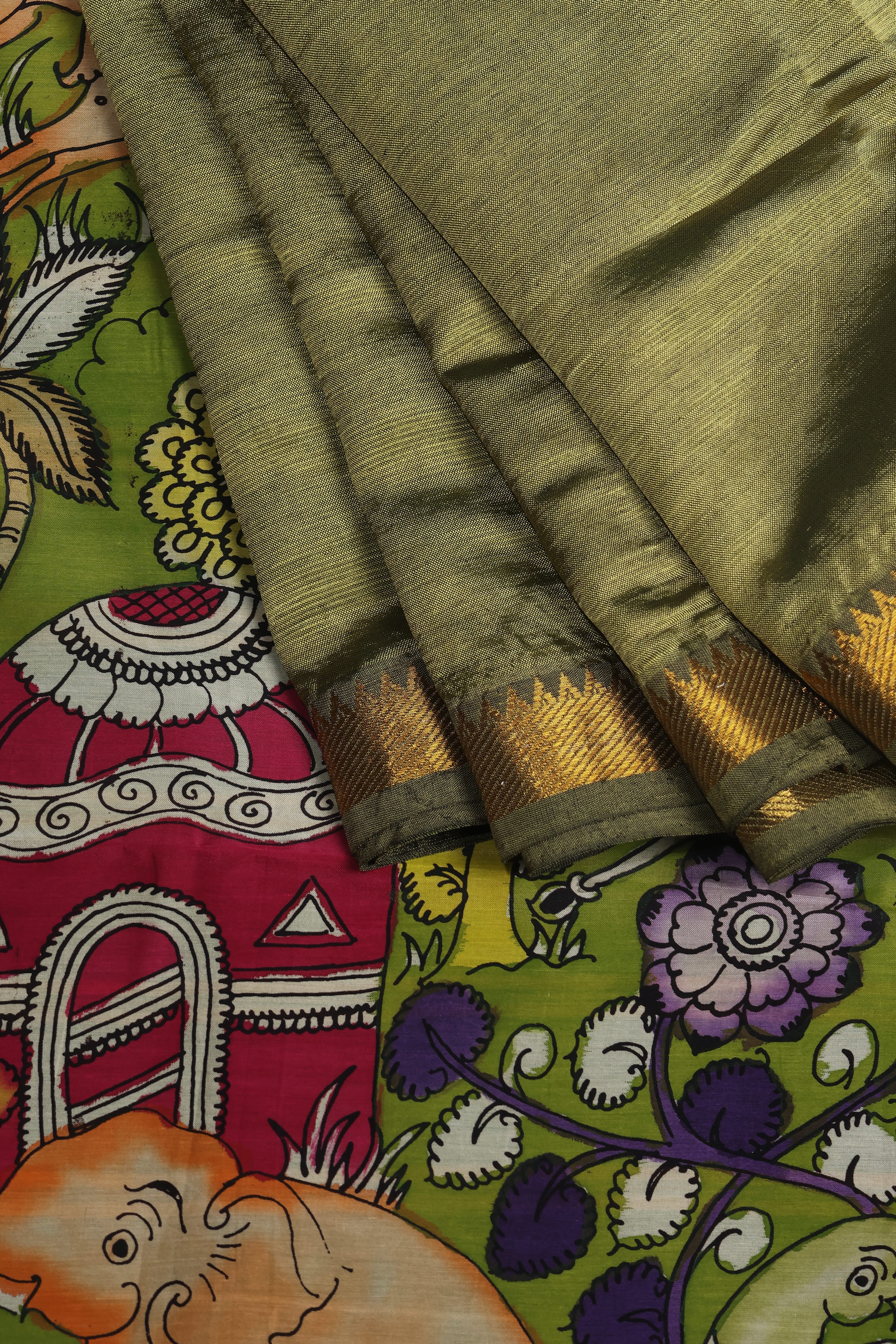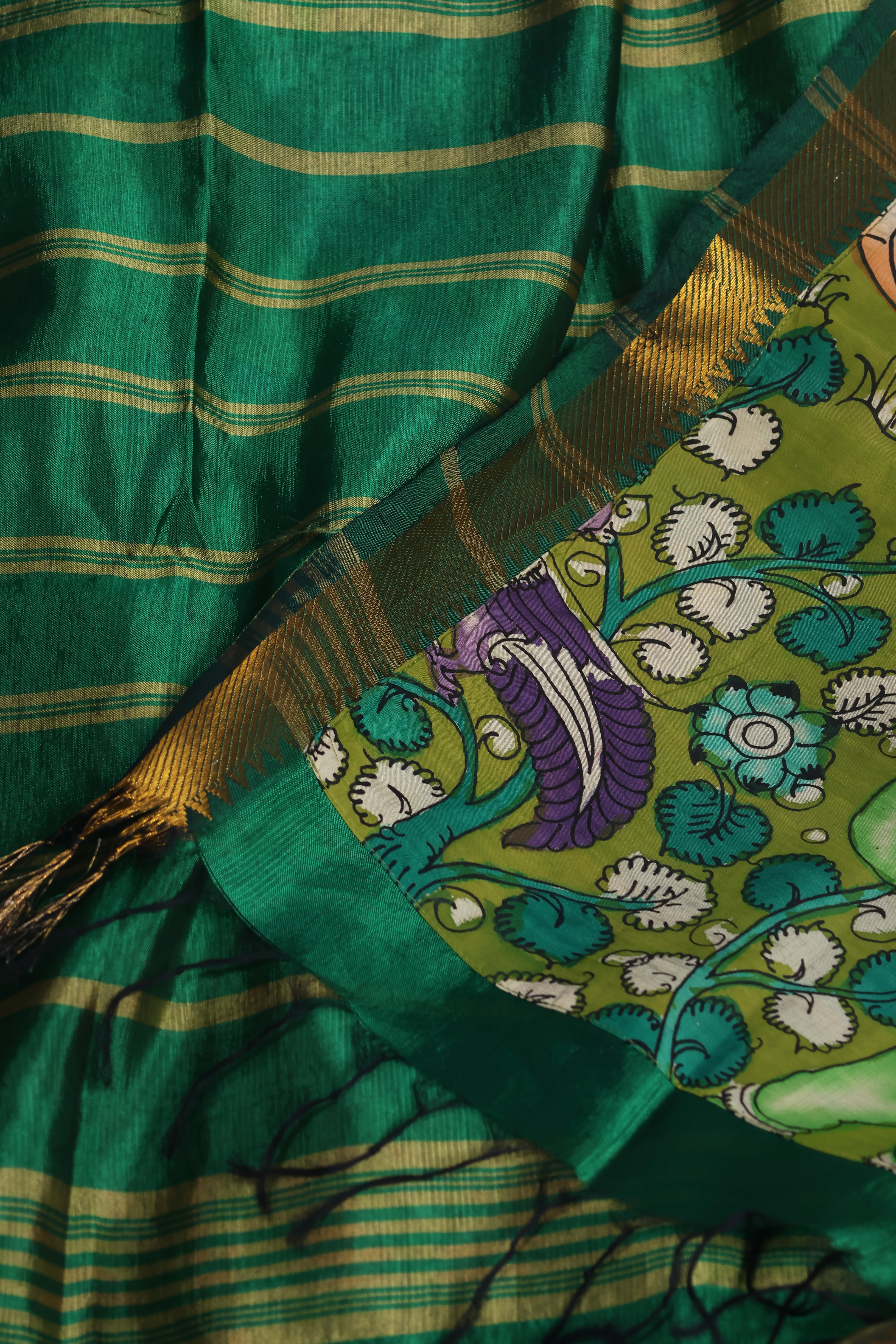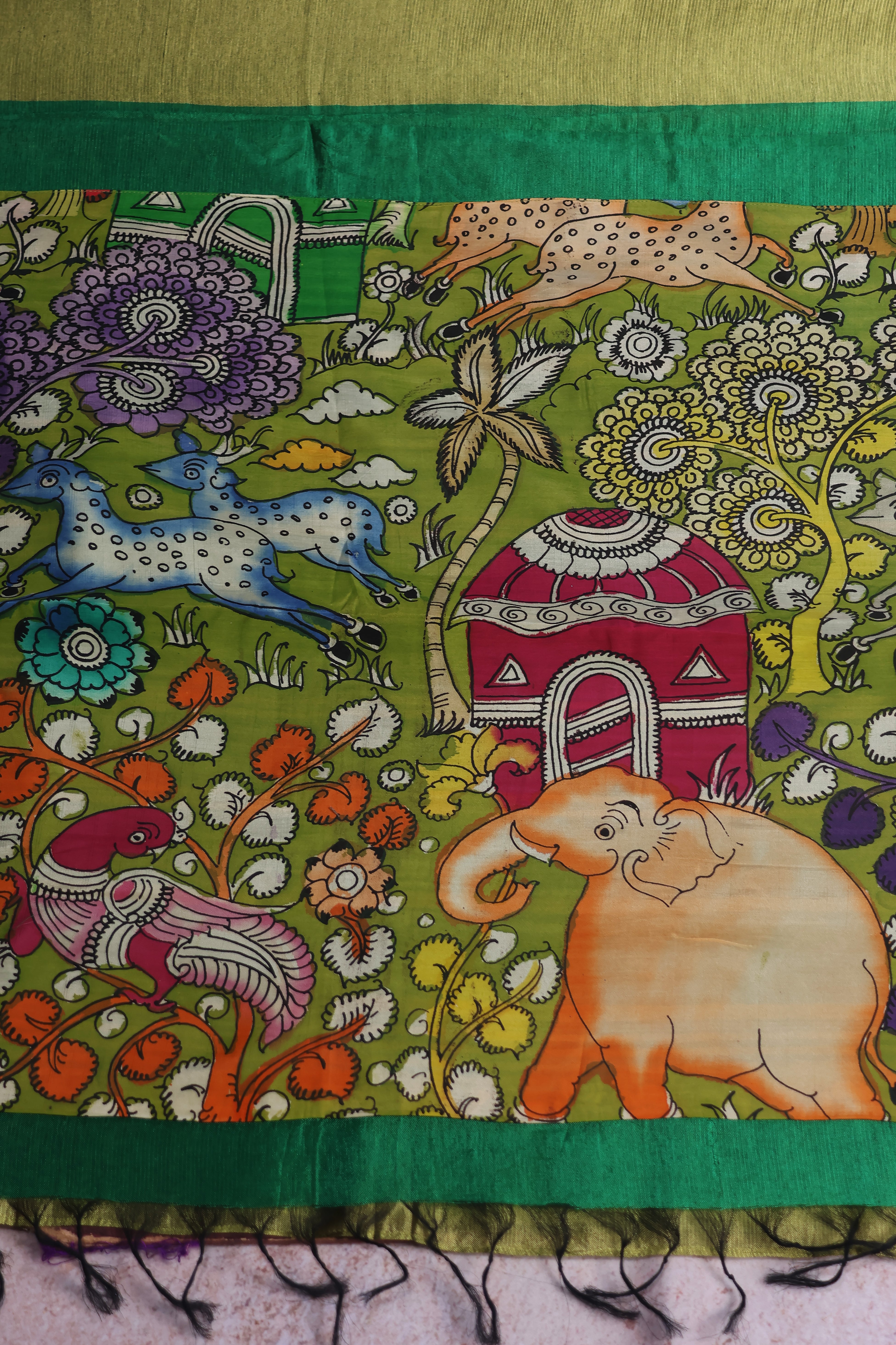 Pure Moss green Mangalgiri silk with a patch work pen Kalamkari Anchal