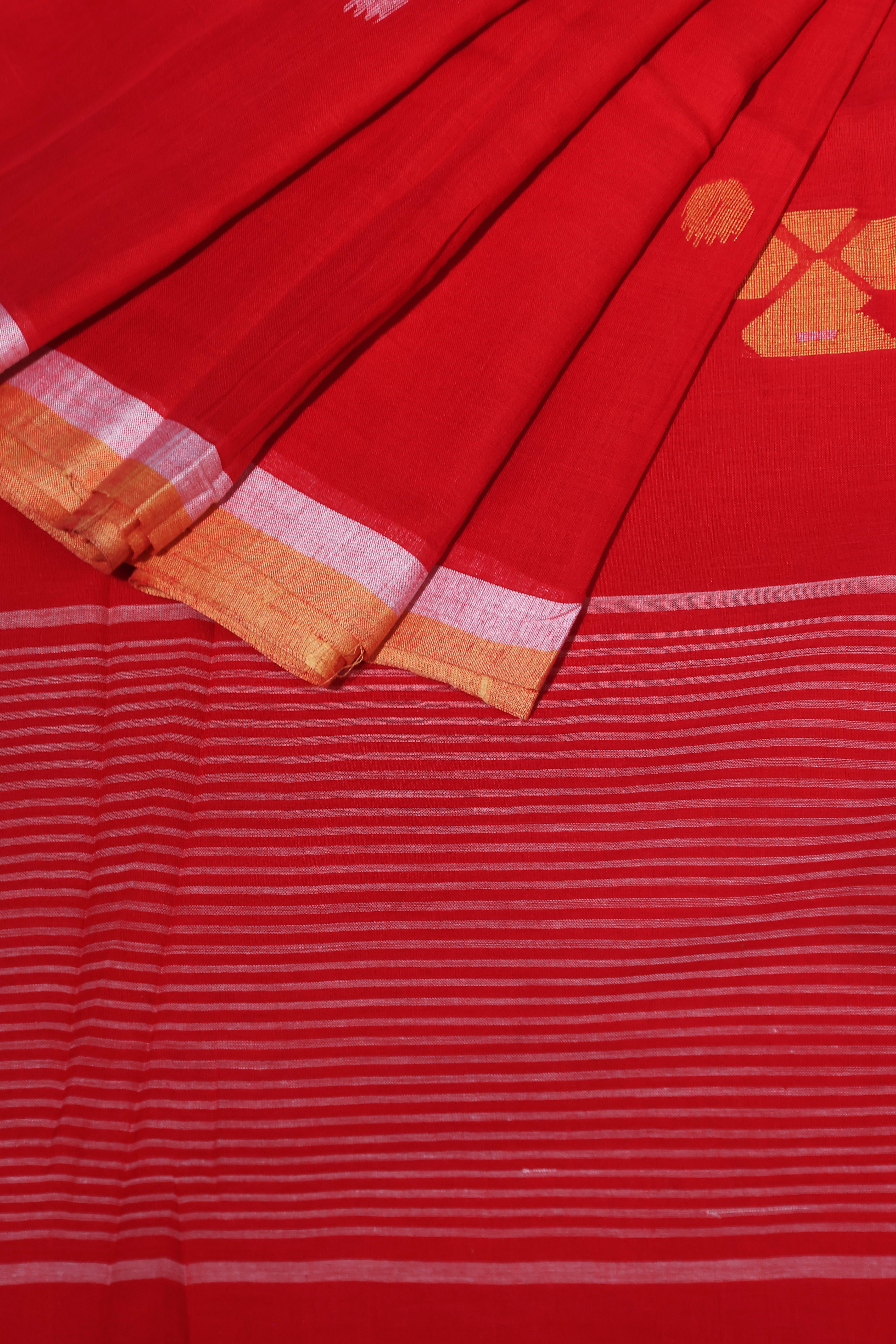Bring timeless elegance to your wardrobe with this red handwoven Jamdani cotton saree, a classic expression of Bengal’s rich handloom heritage. The saree features intricate Jamdani motifs delicately woven throughout the fabric, creating a sophisticated texture and subtle visual rhythm.