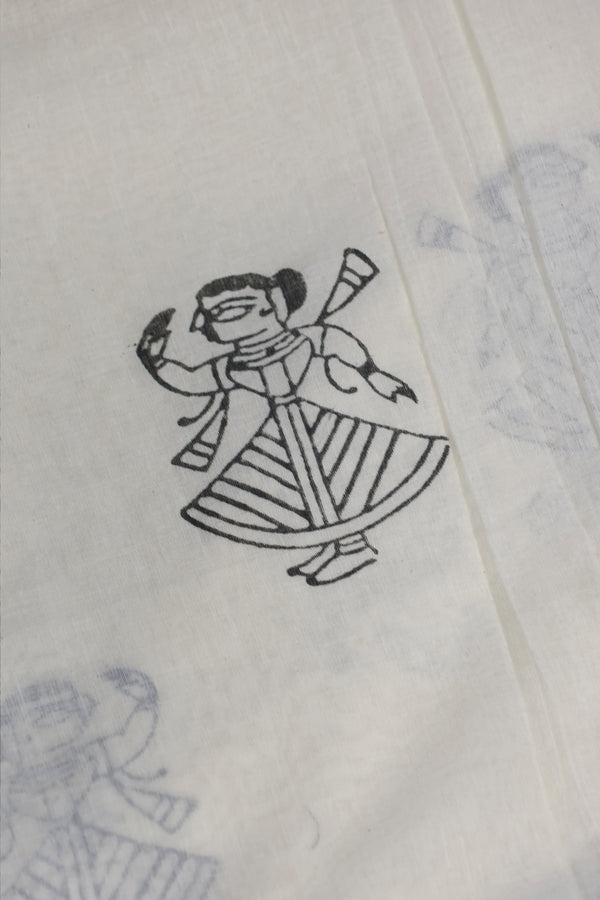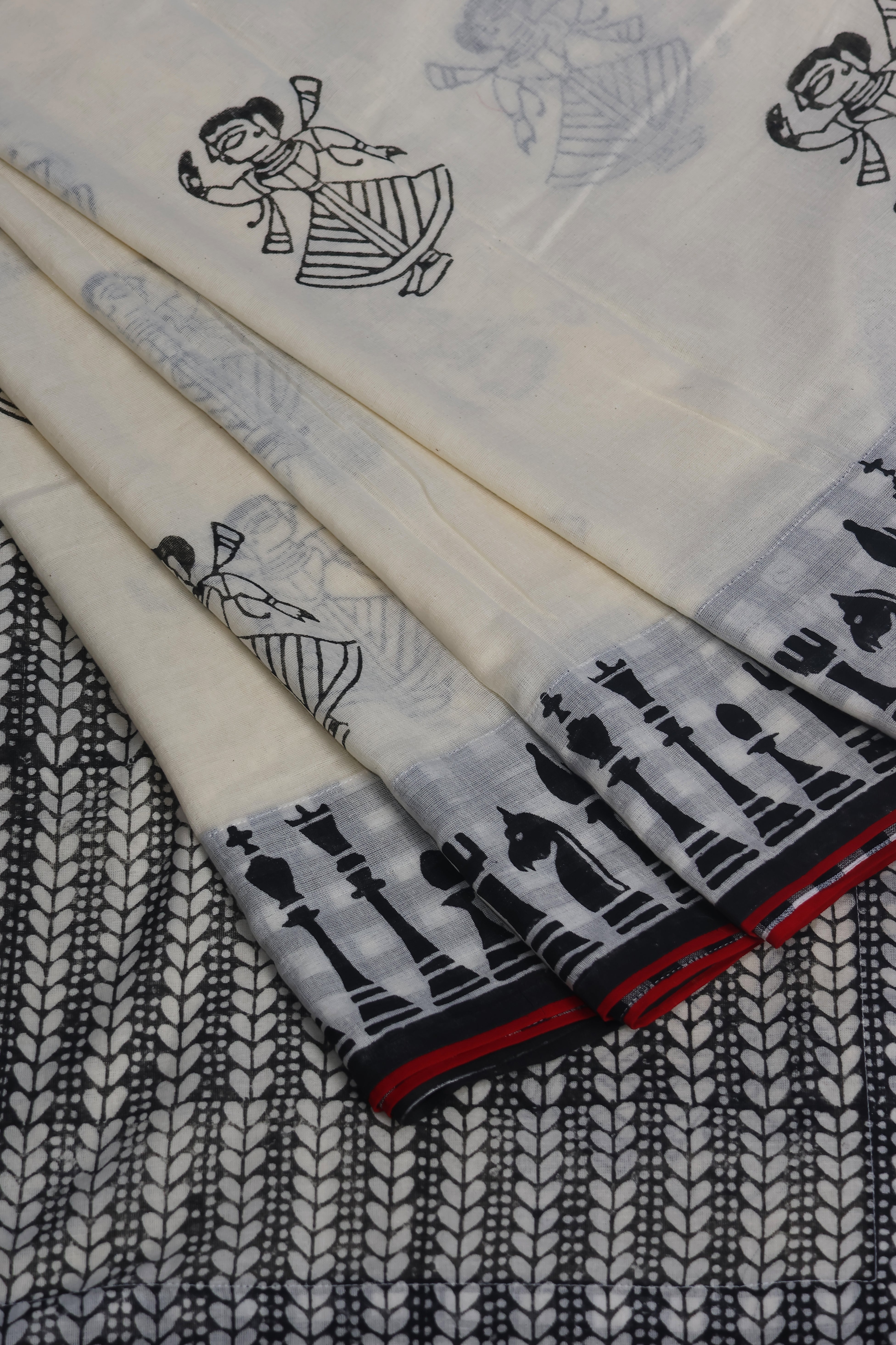 This stunning block-printed saree features black and white checkerboard patterns that echo a chessboard, framed by a striking reverse Gamcha-style border.long the edge, miniature chess pawns stand in line, telling silent stories of strategy and stillness. doll motifs, inspired by the iconic works of Jamini Roy, in soft shades of off-white, black, and hints of red, this Chapa saree captures the raw beauty of hand-printing while carrying the soul of folk tradition. It’s more than wearable — it’s a collector’s piece, made for the artist at heart. Limited edition